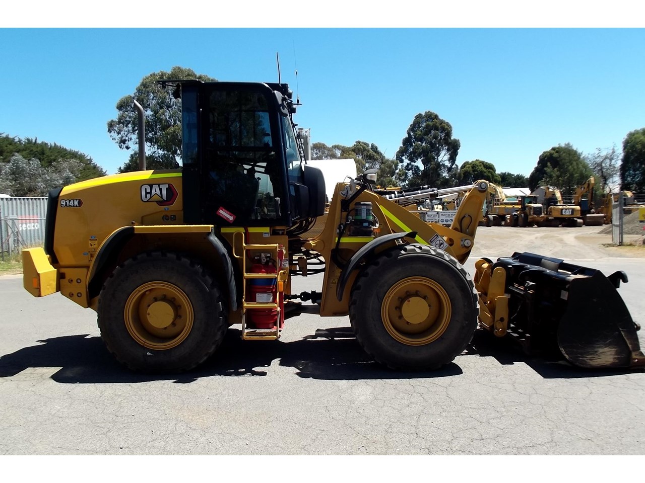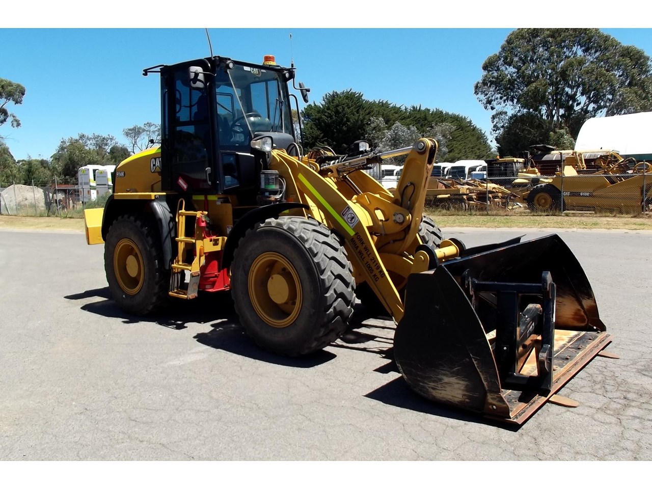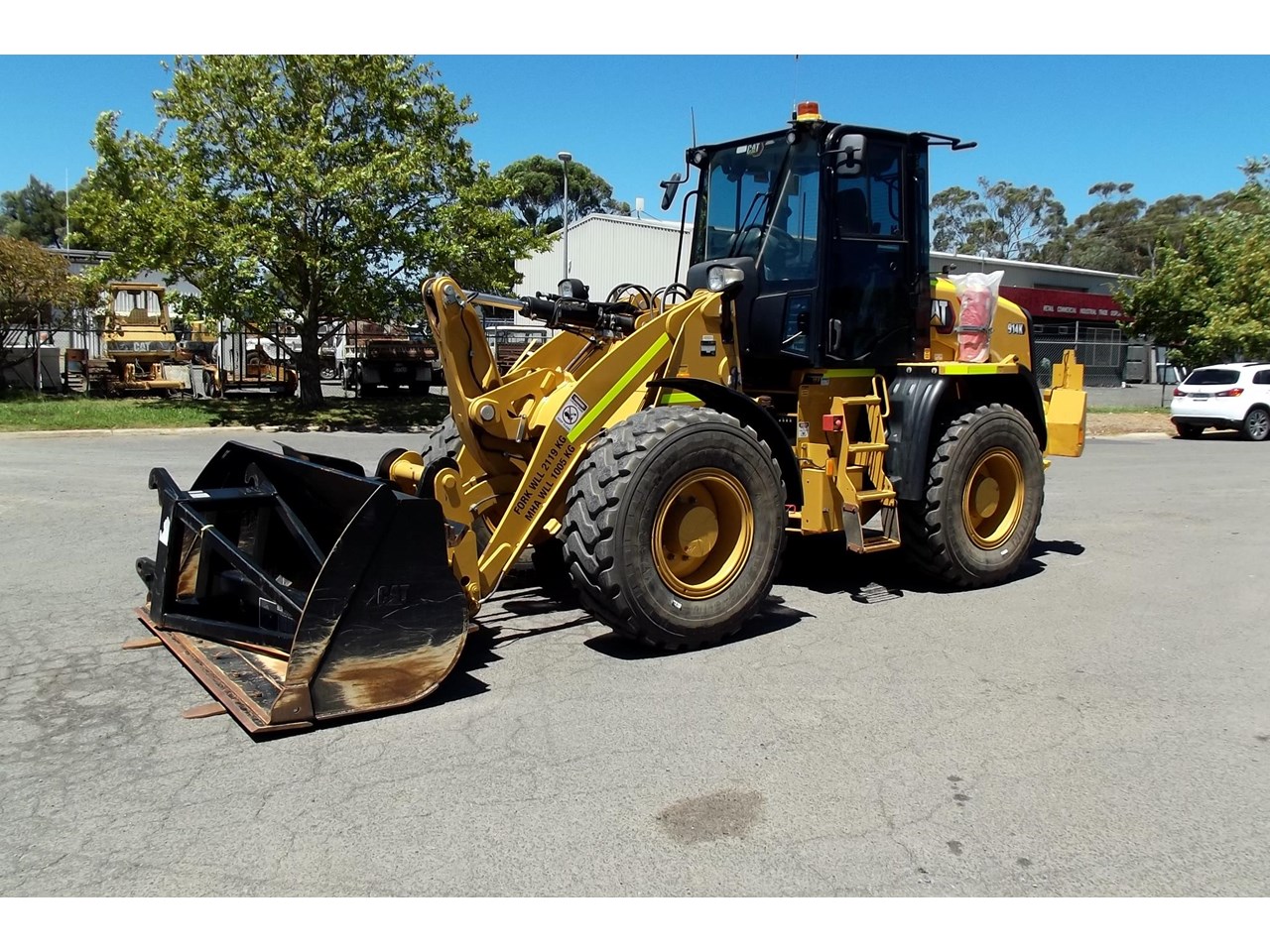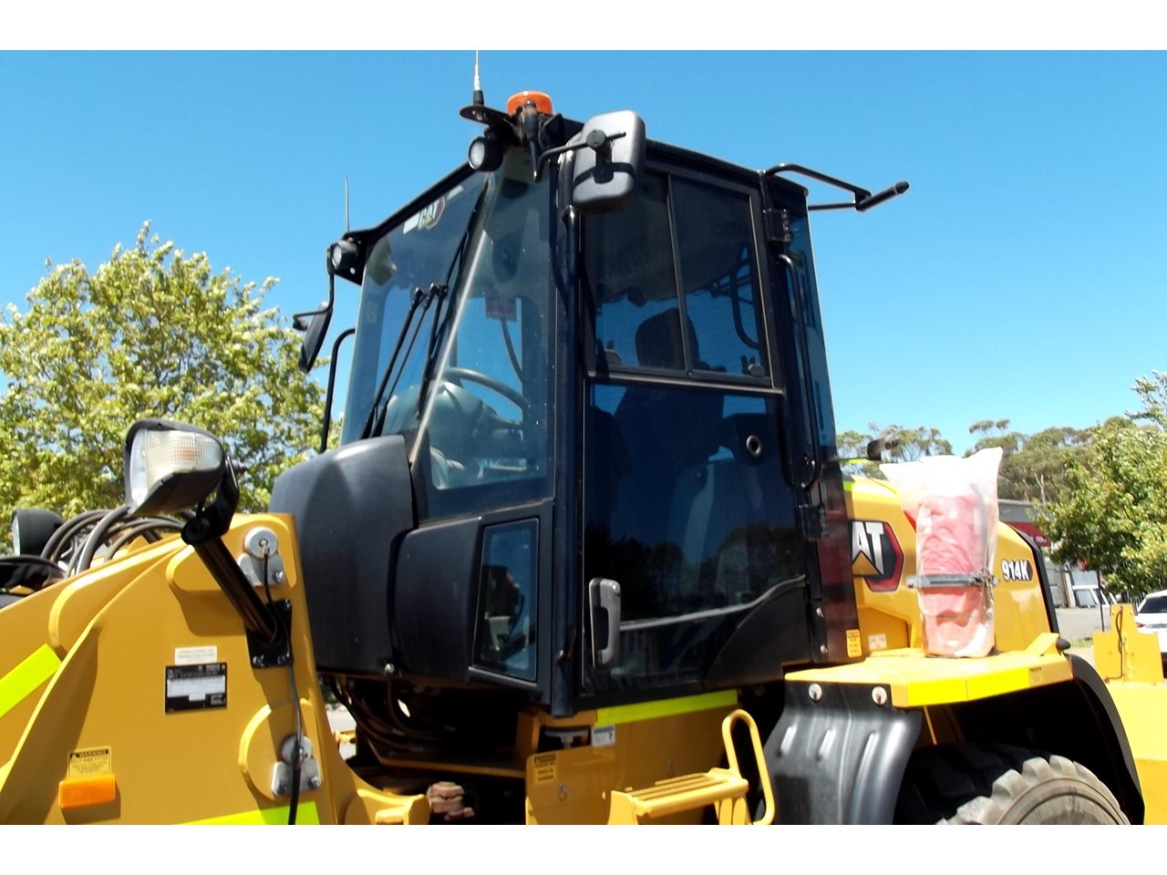 CATERPILLAR 914K TOOL CARRIER, 2022 model with only 660 hours, powered by Cat C4.4,4 Cyl intercooled turbo @ 102HP, hydrostatic transmission with creeper control, enclosed R.O.P.S/F.O.P.S cabin, heater and air conditioning, tinted windows, reverse camera, reverse distance sensing system, radio, uhf, ride control, air suspension seat, orange seat belt, as new 17.5x25 Michelin radial tires, machine equipped with fire suppression system, in cab and external fire extinguishers, led beacon, battery and starter isolators, E stops, Groeneveld auto grease, crane check valves, 3rd hydraulic function, hydraulic quick coupler, Cat 1.6m3 GP bucket with BOE, Cat Crane jib and Cat HD Forks, this Australian delivered machine has the works $170,000 + GST Earthworks Equipment Woodend Vic