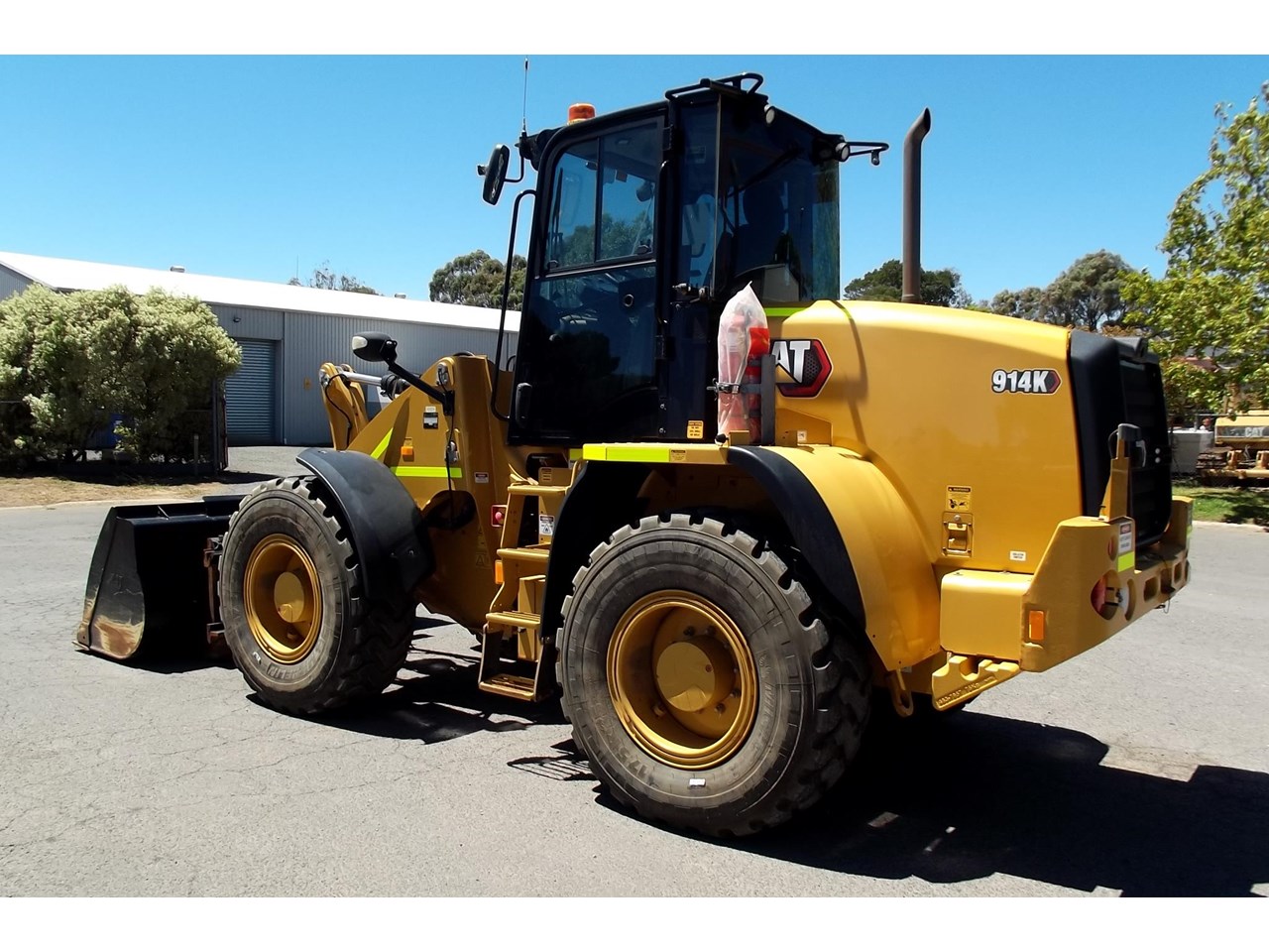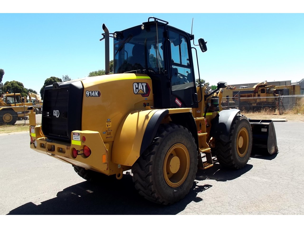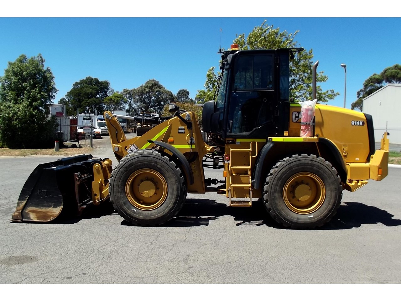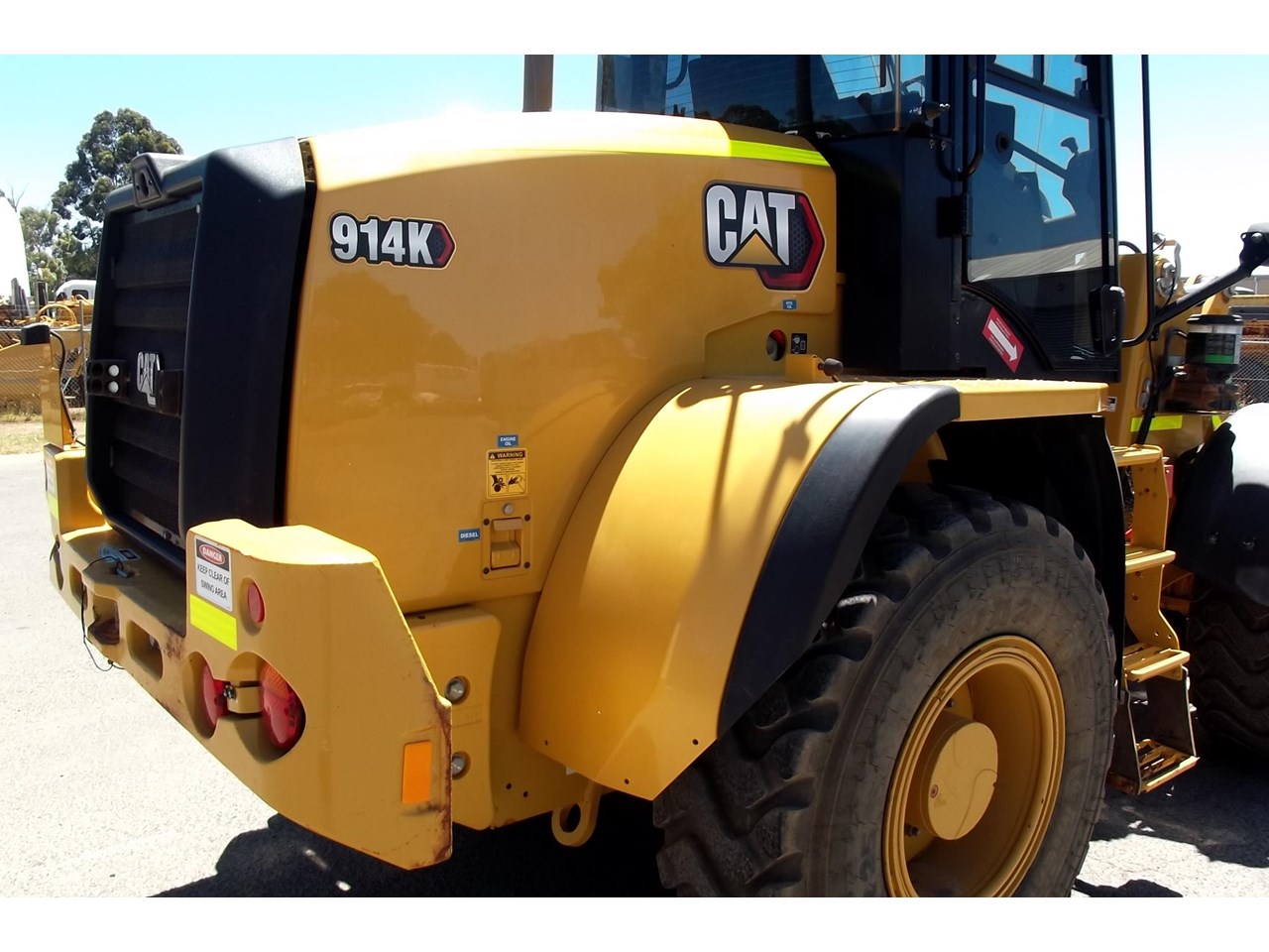 CATERPILLAR 914K TOOL CARRIER, 2022 model with only 660 hours, powered by Cat C4.4,4 Cyl intercooled turbo @ 102HP, hydrostatic transmission with creeper control, enclosed R.O.P.S/F.O.P.S cabin, heater and air conditioning, tinted windows, reverse camera, reverse distance sensing system, radio, uhf, ride control, air suspension seat, orange seat belt, as new 17.5x25 Michelin radial tires, machine equipped with fire suppression system, in cab and external fire extinguishers, led beacon, battery and starter isolators, E stops, Groeneveld auto grease, crane check valves, 3rd hydraulic function, hydraulic quick coupler, Cat 1.6m3 GP bucket with BOE, Cat Crane jib and Cat HD Forks, this Australian delivered machine has the works $170,000 + GST Earthworks Equipment Woodend Vic