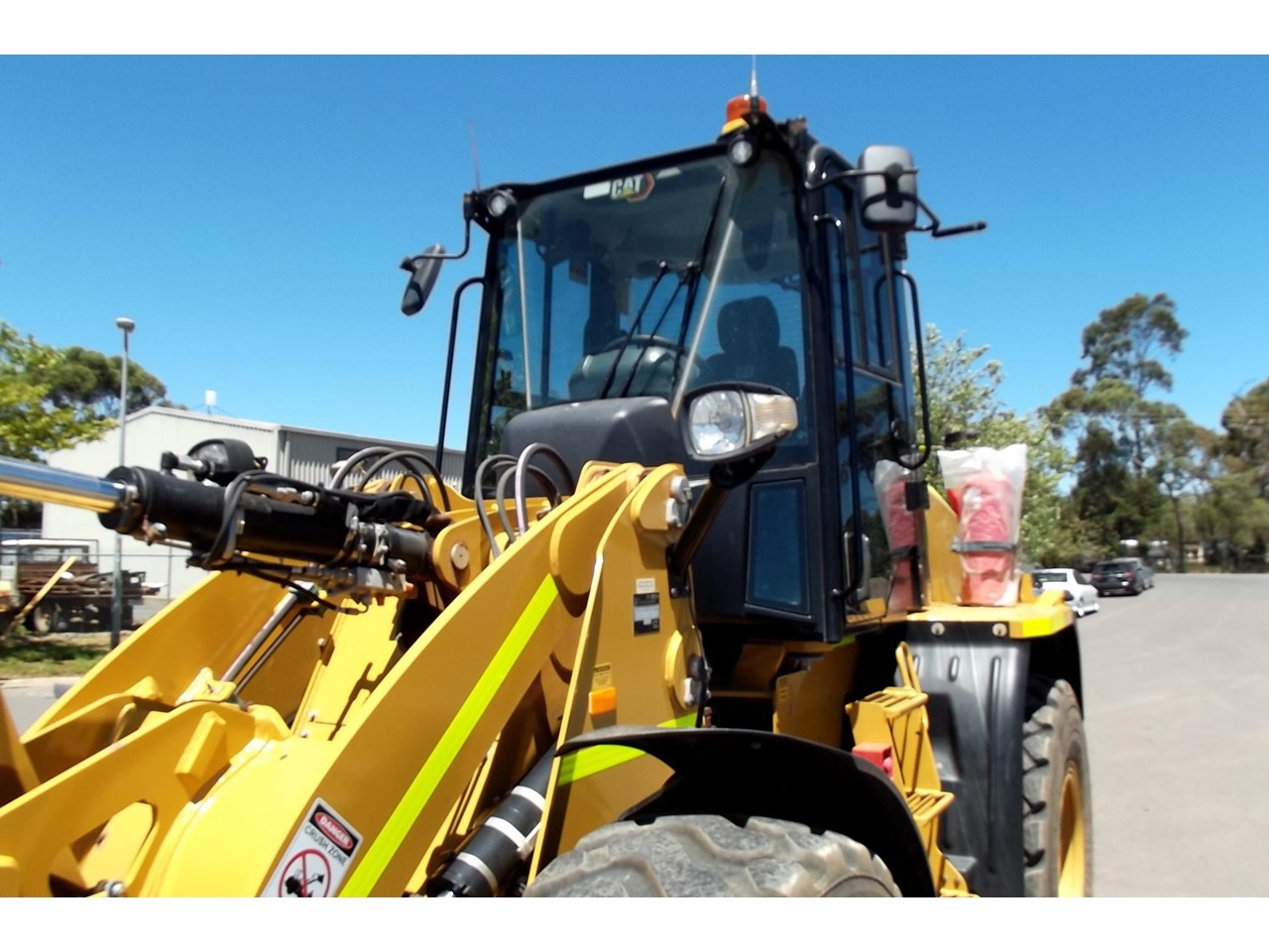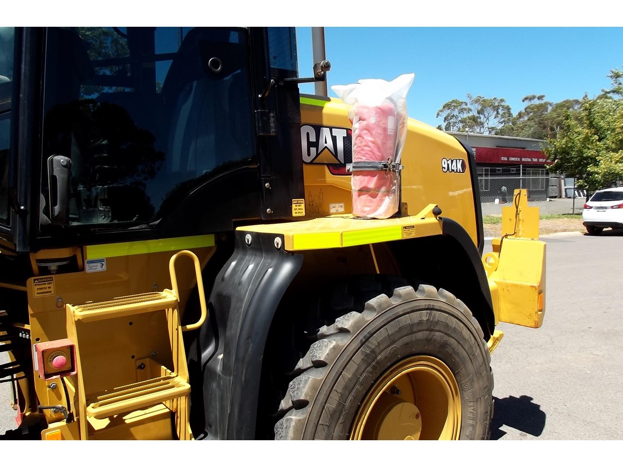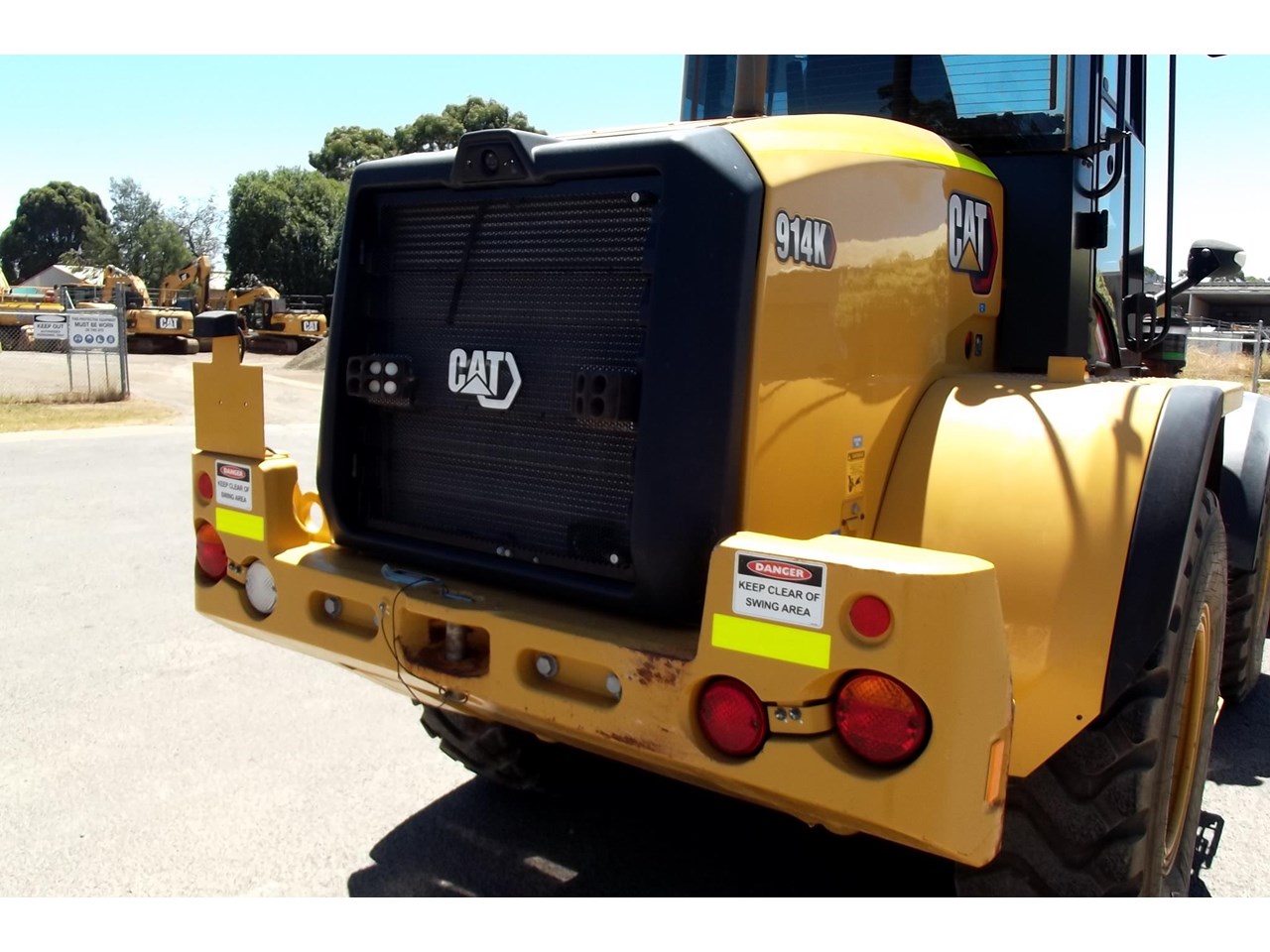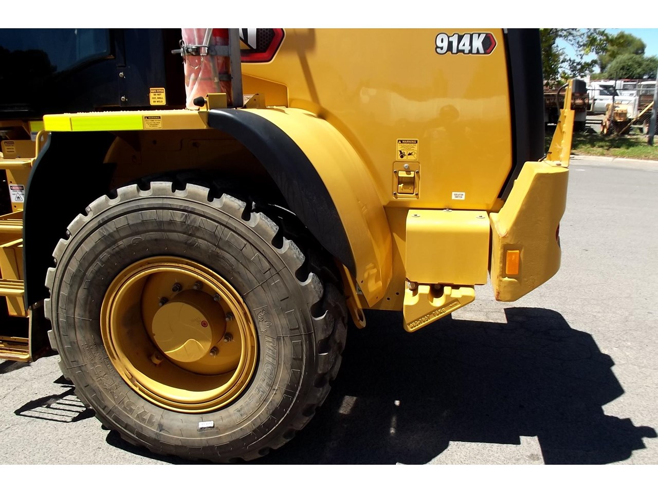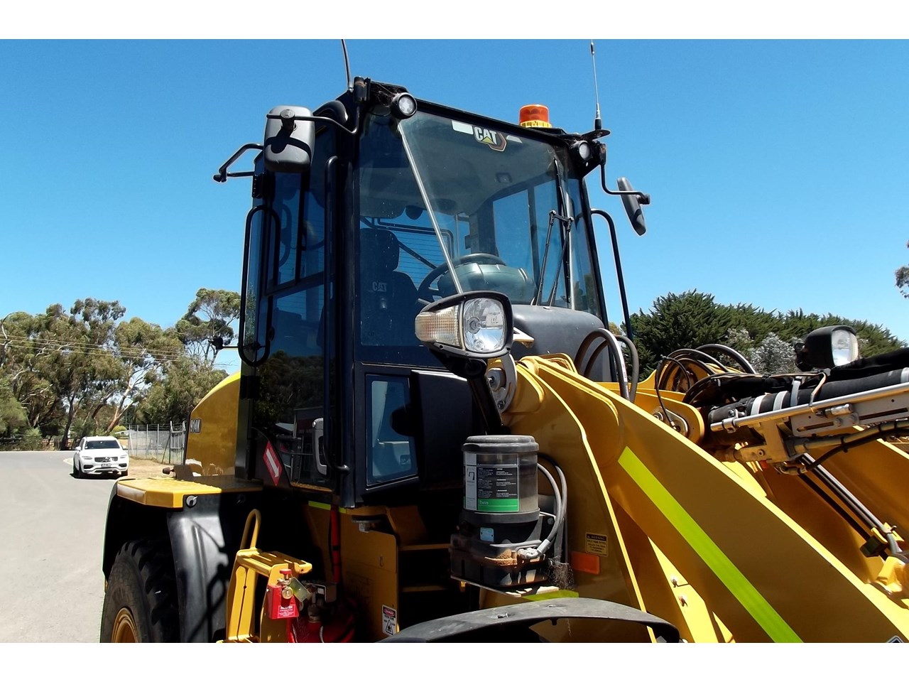 CATERPILLAR 914K TOOL CARRIER, 2022 model with only 660 hours, powered by Cat C4.4,4 Cyl intercooled turbo @ 102HP, hydrostatic transmission with creeper control, enclosed R.O.P.S/F.O.P.S cabin, heater and air conditioning, tinted windows, reverse camera, reverse distance sensing system, radio, uhf, ride control, air suspension seat, orange seat belt, as new 17.5x25 Michelin radial tires, machine equipped with fire suppression system, in cab and external fire extinguishers, led beacon, battery and starter isolators, E stops, Groeneveld auto grease, crane check valves, 3rd hydraulic function, hydraulic quick coupler, Cat 1.6m3 GP bucket with BOE, Cat Crane jib and Cat HD Forks, this Australian delivered machine has the works $170,000 + GST Earthworks Equipment Woodend Vic