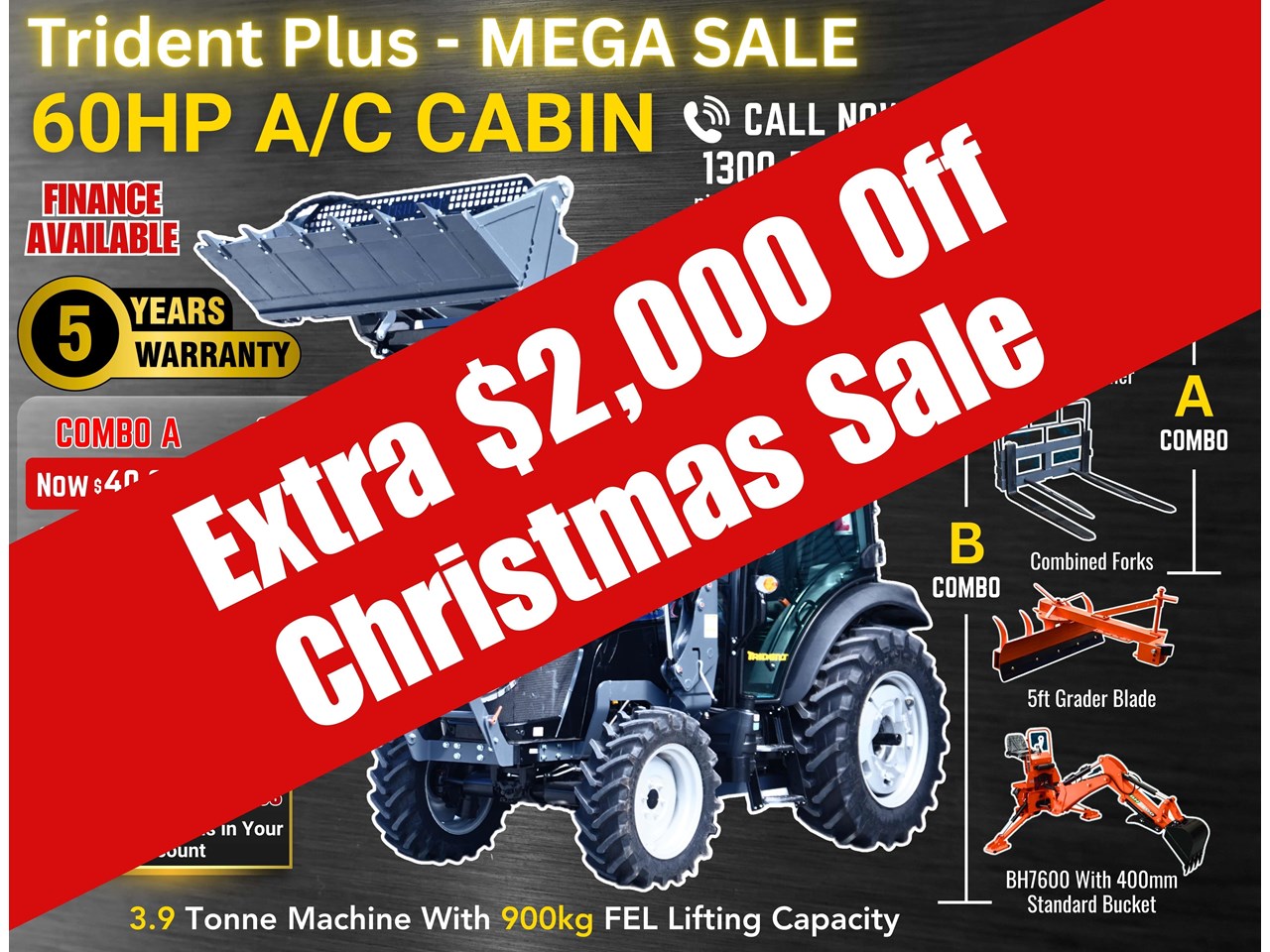 Save $2,000 on the Trident Plus 60HP A/C Cabin Tractor. Enjoy a 5-year labour and parts warranty and free delivery within QLD/SA/NSW/VIC (T & C apply).